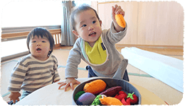 また、総合保育の中に食体験を取り入れています。プランターや畑で苗を植え、種をまき、子供が水やりをしながら育てます。観察して収穫し、調理保育をしています。他にも、旬の野菜にふれたり、手洗い指導・箸の持ち方などを教えています。食べること・遊ぶことは子供にとって生活そのものです。楽しみながら食体験をしてほしいと考えています。